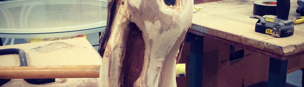 Started roughing in the head of the next sculpture. Found the heart wood of this piece of apple to be rotten. The gapping hole where the rot was became his mouth. Will be a different looking guy for sure. Just in time for Halloween. This head will be mounted on the large branch pictured below and suspended, somewhere, somehow.